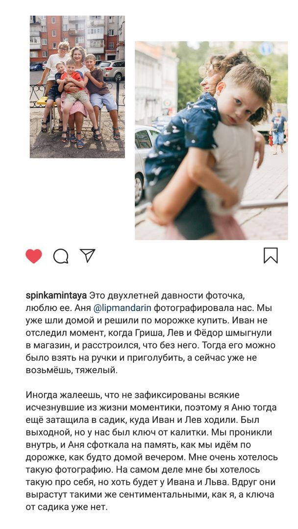 Моя миссия — показать людям, как они красивы и уникальны, какими счастливыми выглядят со стороны; я принимаю их такими, какие они есть — и это фотофиксирую, этим восхищаюсь. Показываю как прекрасен мир в своем несовершенстве, шероховатостях и естественности. Такой подход к красоте и принятию людей пропагандирую и в семейной съёмке тоже.