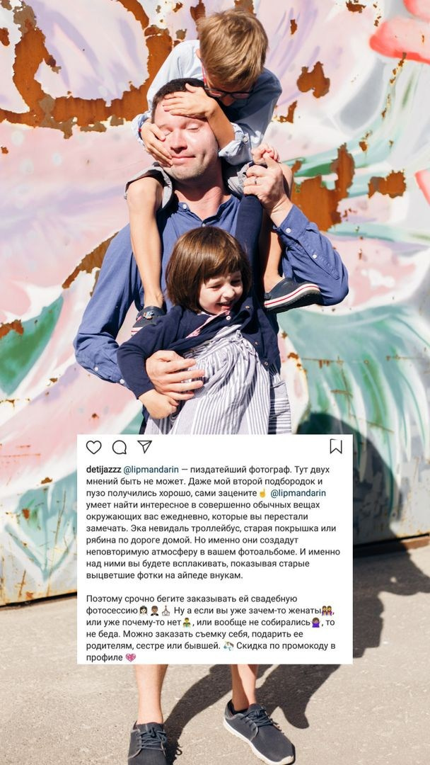 На съёмке для живых и естественных фото я попрошу вас что-нибудь делать: пройтись, поиграть с ребенком, побегать, кормить друг друга и т. п. Когда семья увлечена игрой, едой, прогулкой — то я не вмешиваюсь. Что делать, куда смотреть, только изредка. А бабушек и других ассистентов я прошу без криков поддержки и «Посмотри на тётю», хотя эти дипломатические переговоры проходят по-разному. Несколько фотографий со взглядом всех героев в камеру обязательно будет. Такие и для рамочки пригодятся, и чтобы бабушкам послать)